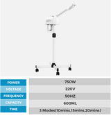• Rolling Base with Wheels: This facial steamer comes with a stable, mobile rolling base, which makes it easy to move around the room or salon. The wheels ensure smooth mobility, which is perfect for any salon or beauty treatment setup.